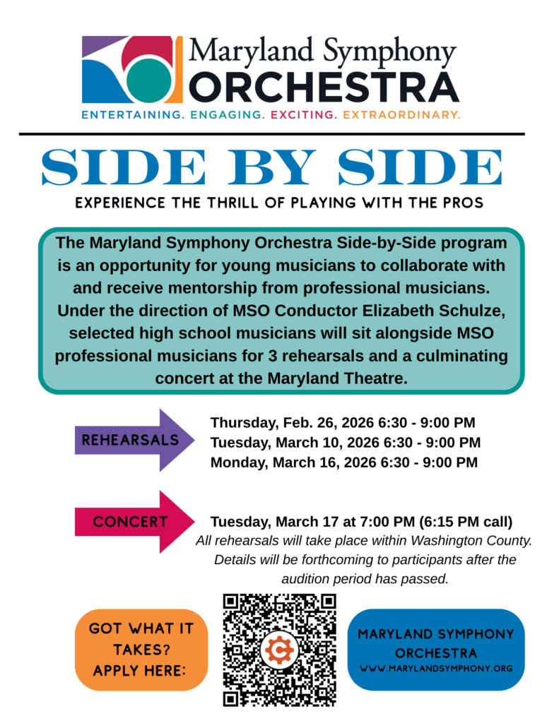 The “Side-by-Side” program by the Maryland Symphony Orchestra is an opportunity for MSO musicians and young talents to collaborate. In this program, high school students sit alongside experienced musicians during rehearsals and a dedicated concert. They all play the same musical pieces, follow the conductor’s guidance, and work together to create beautiful music. The highlight of this experience is the Side-by-Side concert, where the collective effort is showcased, demonstrating how well they can create music as a unified team.